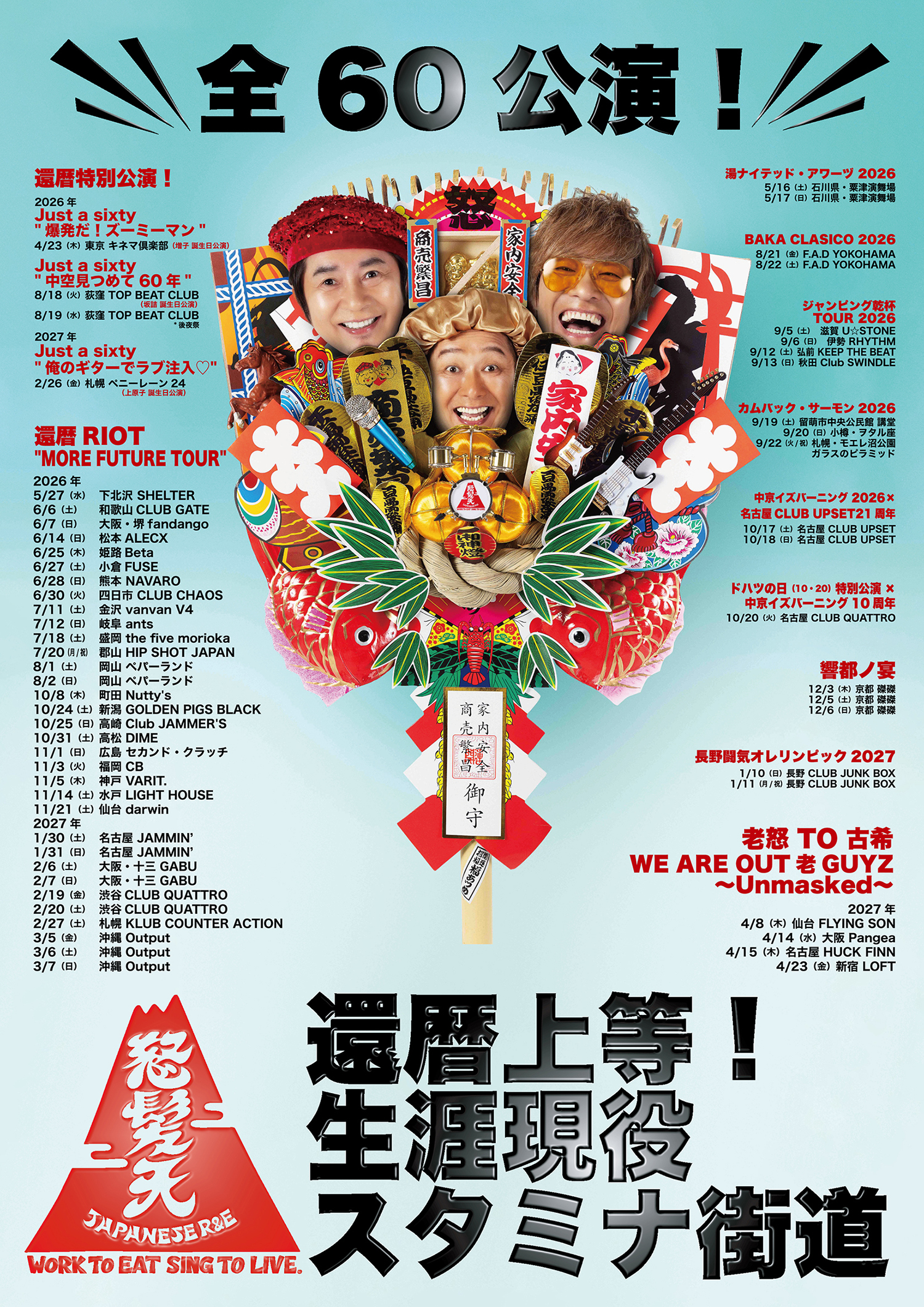 <上原子 出演情報> 5月22日(金)荻窪 TOP BEAT CLUB にて馬渕太成ソロワンマン CONCERT 「瞬間と永遠の間で」の開催が決定。上原子が"馬渕太成&TACTIX"として出演します。 2026.3.6 UP ”還暦上等!生涯現役スタミナ街道” 追加情報と一部日程変更のご案内 <日程/会場発表> カムバック・サーモン2026 9/19(土)留萌市中央公民館 講堂 9/20(日)小樽・ヲタル座 9/22(火/祝)札幌・モエレ沼公園 ガラスのピラミッド 還暦RIOT "MORE FUTURE TOUR" 2027年 2/19(金)渋谷CLUB QUATTRO 2/20(土)渋谷CLUB QUATTRO <開催日程変更> 長野闘気オレリンピック2027 1/10(日)長野 CLUB JUNK BOX 1/11(月/祝)長野 CLUB JUNK BOX ※1/9・10開催より上記日程へ変更となりました。 8月以降の各公演詳細、チケット先行のご案内は4月以降を予定しております。今しばらくお待ちください! 2026.3.4 UP 2026年5月30日(土)・31日(日)日比谷音楽祭2026へ出演決定!怒髪天アコースティックセッションで出演します! 出演日、ステージ、コンサートの鑑賞方法等は後日発表となります。詳しくはオフィシャルサイトへ! 2026.3.1 UP MEDIA →<WEB>を更新。 2026.2.27 UP MEDIA →<RADIO>を更新。 2026.2.24 UP 怒髪店 商品追加! エリア1020 TOURにて販売していたグッズを追加しました!在庫限り、3月中旬頃までの販売予定です。お早めにご利用ください! 2026.2.19 UP MEDIA →<RADIO>を更新。 2026.2.15 UP 2026年5月7日(木) Zepp Shinjuku (TOKYO)にて開催されるまちゃまちゃ30年祭&生誕祭「独身披露宴」へ出演決定! 2026.2.14 UP <侍青會:エキストラ募集> 侍青會会員の皆様へミュージックビデオ・エキストラ募集のご案内を掲載。詳しくは侍青會ウェブサイトをチェック! 2026.2.13 UP 2026年5月4日(月/祝)・5日(火/祝) 熱海芸妓見番にて開催される「熱海浮世離れ歌謡祭2026」へ出演決定!怒髪天は5日の第二部に出演します。 2026.2.12 UP MEDIA →<RADIO>を更新。 2026.2.10 UP ROOTS66、「The Covers スプリングFes」へ出演決定! 増子直純も出演させていただきます。 詳しくは公式HPをチェック! 侍青會会員限定トークイベント開催!会員の皆様、詳しくは侍青會ウェブサイトをチェック! 2026.2.6 UP 2026年3月28日(土)・29日(日) 藤沢市民会館 にて開催される『藤沢 ROCK寿祭 2026』に出演決定。怒髪天は29日のRED ZONE LIVE@小ホールに出演します。券種や発売等、詳しくはオフィシャルサイトへ! 2026.2.2 UP <坂詰 出演情報> 3月6日(金)新宿・歌舞伎町 広島SOUL酒場 KAVACH-YA にてTELEZUME,のワンマン公演開催! 2026.2.1 UP 増子・坂詰出演 ROOTS66 -NEW BEGINNING 60- supported by tabiwa 大阪公演、全国の映画館にてライブビューイング決定! 2026年3月22日(日)17:30開演 2/5〜チケット先行受付もございます。詳しくはオフィシャルサイトをチェック! |